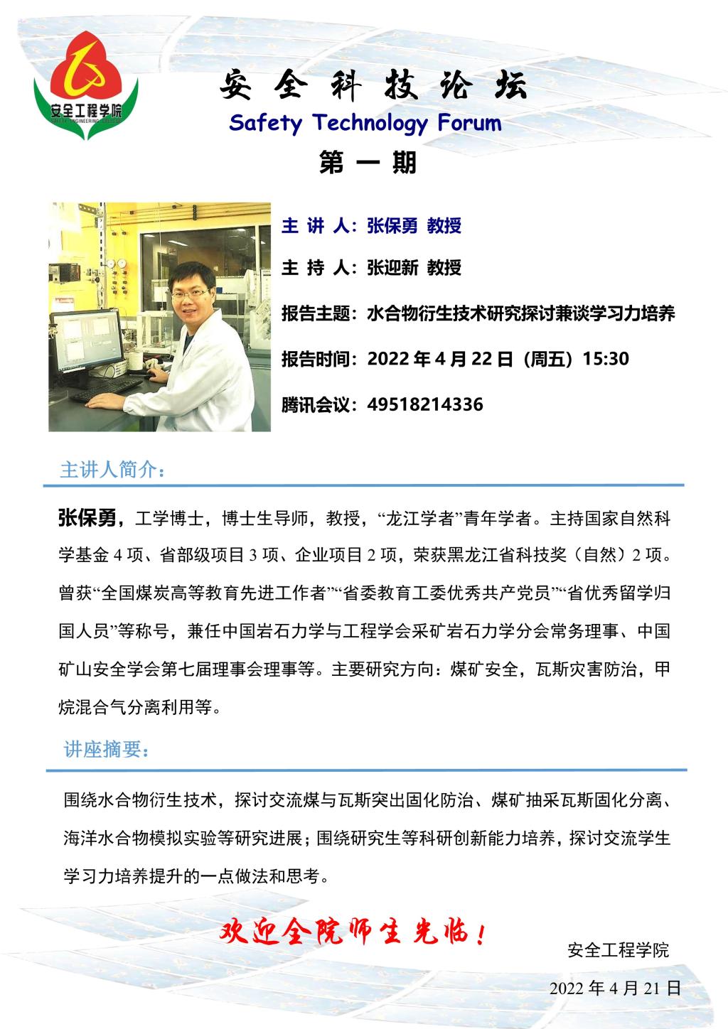安全科技论坛第一期 主讲人 张保勇教授