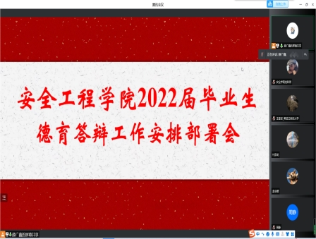 4月5日晚18:30,学院通过腾讯会议线上召开了2022届毕业生德育答辩业务培训会,德育答辩工作委员会成员及全体德育论文指导教师参加了会议。会议由辅导员薛广鑫主持,并结合《安全学院2022届本科毕业生德育答辩工作实施方案》对全体与会成员进行了业务培训。最后,党委副书记郑红岩对德育答辩整体工作强调了以下几点:一、高度重视。牢牢契合学校“五观、五四四”德育目标,迅速启动德育答辩工作。二、精心指导。从确定题目开始,反复推敲,结合学生自身实际情况进行系统梳理。三、严格把关。指导教师要切实履行工作职责,确保德育答辩工作的过程严格、质量过关。