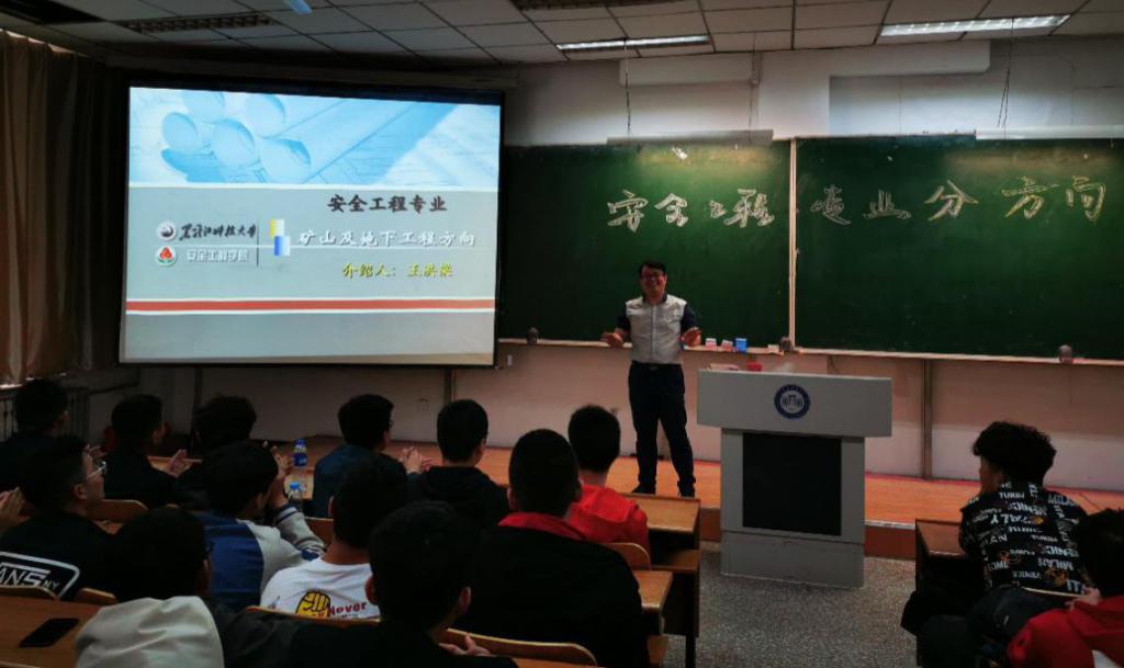 随后,矿山及地下工程安全方向的负责人王洪粱老师就该方向的发展趋势、课程体系、就业前景等方面为同学们作了详细介绍。王老师拥有非常丰富的教学经验以及工作经验,他的精彩宣讲为大家展现了一个和以往完全不一样的新领域,让大家了解到什么是智能矿山,什么是现代城市地下空间工程,从而改变了同学们对“矿山及地下工程安全”这一专业的一些错误认知,让同学们了解了这个方向的前景,增强了大家学习的兴趣。