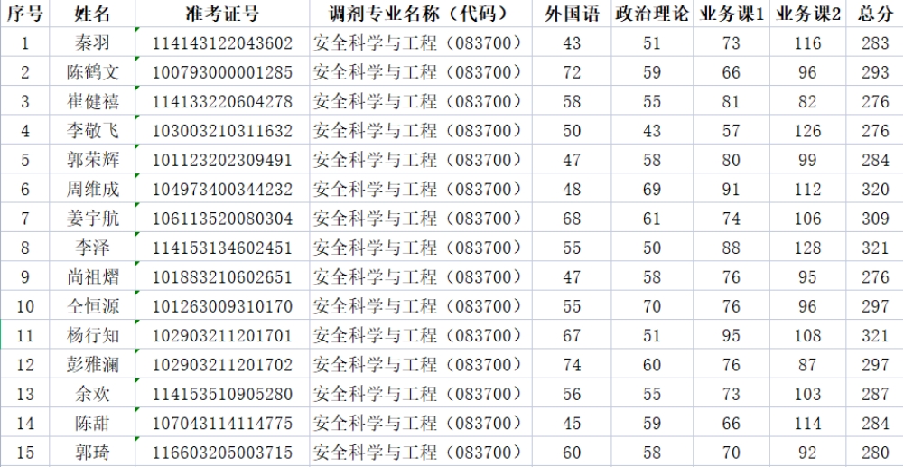 经leyu乐鱼官方网站研究生招生工作领导小组审核,以下考生可参加leyu乐鱼官网安全科学与工程专业调剂复试,名单公示如下:
